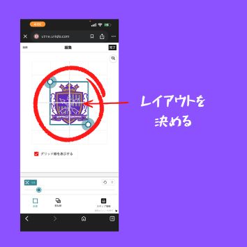 スタンプをTシャツ上で動かして、配置・サイズを調整します。グリッド表示をオンにすると位置合わせがしやすいです。